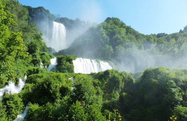 La Cascata delle Marmore è formata da due fiumi: il Velino che arriva dalla valle reatina si getta nel sottostante fiume Nera con un salto complessivo di 165 metri e insieme procedono nella corsa che li porterà al mare.